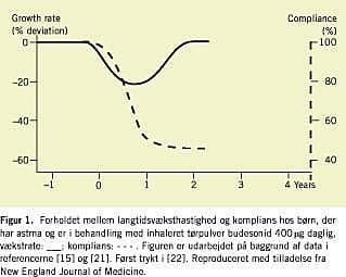 Ser man på samtlige foreliggende data, kan det konstateres, at man ikke i noget studie har fundet reduceret højdevækst-hastighed efter budesonid- eller fluticasondoser på under 400 μ g daglig [1, 15-18]. Beclometasondipropionatdoser på 300-400 μ g daglig givet som aerosolspray er imidlertid fundet at hæmme væksthastigheden [17], og i et Cochrane-review konkluderede man på baggrund af tre randomiserede studier (n=273), at 7-12 måneders behandling med beclometason dipropionat 400 μ g daglig fra en pulverinhalator reducerer højdevæksthastigheden med gennemsnitlig 1,54 cm over et år svarende til en reduktion i væksthastighed på c a. 25% [19]. Meget parallelt til dette fund er budesonid 400 μ g/dag fra en pulverinhalator til børn fulgt i op til fire år rapporteret at være relateret til en nedsat væksthastighed på ca. 20% det første år [15]. Frem mod to års behandlingsvarighed blev væksten imidlertid normaliseret, og der blev ikke fundet effekt på højden efter fire års behandling. Denne observation førte til den antagelse, at inhalationssteroiders væksthæmmende effekt kunne være forbigående og derfor ikke medfører påvirket sluthøjde, selv om der kan være en hæmning af væksthastigheden i nogle måneder til år efter påbegyndt behandling. Den med tiden aftagende suppression af væksten kunne være udtryk for kroppens tilpasning til det eksogene steroids syste-miske effekt på samme måde som sensitiviteten for systemiske steroiders osteoporoiske effekt ofte falder efter de første seks måneders behandling [20]. En anden mulig forklaring kunne imidlertid være den, at komplians under langtidsbehandling med inhalerede steroider falder med tiden. Kun i et fåtal af de studier, hvori man har beskæftiget sig med inhalationssteroiders påvirkning af væksten over længere tid, har inkluderet parametre for komplians, og det forhold bør nævnes som en betydelig metodologisk indvending. I et studie, hvor der til vurdering af komplians blev indbygget en elektronisk chip i en pulverinhalator med budesonid, blev komplians hos børn med astma bestemt til kun at være 40-50% efter 6-12 måneders behandling [21]. Det sandsynliggør, at den observerede normalisering af højdevæksten efter behandling i et år eller mere i al fald i nogen grad kan relateres til nedsat komplians med inhalationsbehandlingen (Figur 1 ) [22]. Ved fortolkning af fremtidige studier af inhalationssteroiders påvirkning af langtidsvækst og sluthøjde for den sags skyld, vil det derfor være nødvendigt at skelne mellem langtidsordinering af og langtidsbehandling med inhalationssteroider. Det må være et uomgængeligt krav til sådanne evalueringer, at de implementerer mål for komplians.