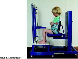 Anvendelse af knemometeret har i de senere år bidraget til værdifuld viden om vækstpåvirkning af inhalerede steroider [23]. Knemometeret er et måleapparatur, en målestol, der anvendes til noninvasiv måling af underbenets længde fra overfladen af det flekterede knæ til undersiden af fodsålen på det siddende barn (Figur 2 ). Knemometri er en meget reproducerbar og præcis målemetode med en måleusikkerhed på 0,09-0,13 mm. Den gennemsnitlige underbensvæksthastighed hos normale børn over et år er 0,4 mm/uge [24]. Knemometri har vist sig at være værdifuld til afdækning af en række aspekter af inhalerede steroiders væksthæmmende potentiale. Metoden giver mulighed for at udføre vækstevalueringer i randomiserede, dobbeltblindede, overkrydsnings- og parallelgruppedesign med behandlingsperioder på få uger. De korte behandlingsperioder muliggør samtidig kontrol af andre vækstinfluerende faktorer hos børn med astma, såsom varia-tioner i sygdomsaktivitet, komplians, spontan vækstaktivitet og pubertetsudvikling samt anvendelse af anden antiastma-behandling. En betydelig del af den viden, vi i dag har om inhalerede steroiders effekt på korttidsvækst, stammer således fra studier med knemometeret. Disse studier har vist, at risikoen for væksthæmning ved inhalerede steroider afhænger af dosis, administrationsregimen, applikationsform og det specifikke steroid.
