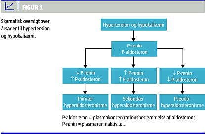 Hypertension og hypokaliæmi er en velkendt medicinsk problemstilling, som undertiden kan volde differentialdiagnostiske vanskeligheder. De klassiske årsager er primær og sekundær hyperaldosteronisme. Udredningen bør påbegyndes med plasmakoncentrationsbestemmelse af aldosteron (P-aldosteron) og plasmareninaktivitet (P-renin), og på baggrund af disse værdier vil patienten kunne placeres inden for tre hovedkategorier (Figur 1 ) [3].