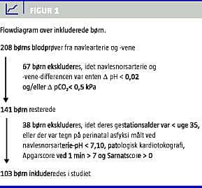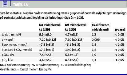 Materiale og metoder: Studiet omfatter 208 nyfødte, hvor navlesnoren inden for 30 sekunder blev dobbelt afnavlet, hvorefter der straks blev udtaget to blodprøver, en fra navlearterie og en fra navlevene. Inklusionskriterierne var gestastionsalder højere end 35 fulde uger, ingen tegn til føtal hypoksi eller evident perinatal asfyksi.