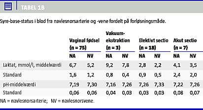 I Tabel 1B ses desuden middelværdier og spredning for laktat og pH fordelt på fødselsmåde. Vi fandt signifikant forskel i laktat og pH på fødselsmåde (envejsanova p = 0,0001), således at både pH-værdier i arterie og vene var lavere hos børn, der var født vaginalt (højest hos børn født ved elektivt sectio), og laktat var lavere.