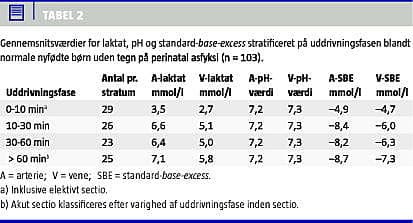I Tabel 2 ses middelværdier for laktat, pH og standard BE (SBE) stratificeret på uddrivningsfasens varighed. Lineær regressionsanalyse med uddrivningsfasens varighed som den uafhængige variabel og laktat som afhængig variabel viste en signifikant stigning i laktat, jo længere uddrivningsfasen varede (0,02 mmol/l/minut).