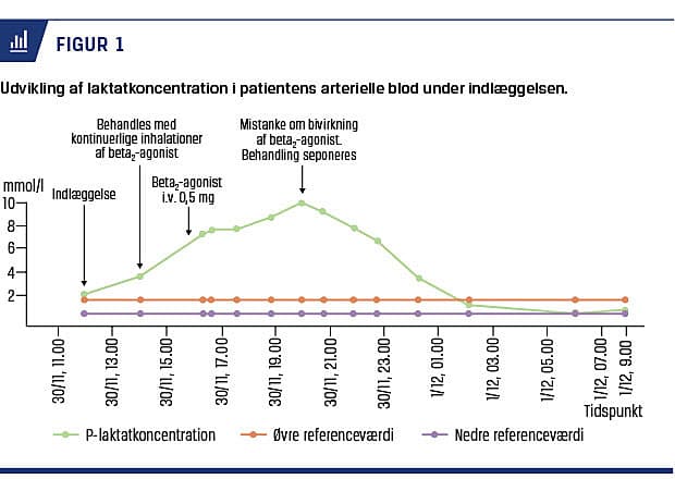 En 24-årig kvinde med svær astma blev akut indlagt på grund af åndenød efter nogle dage med symptomer på øvre luftvejs-infektion. Hun havde inden indlæggelsen øget sit forbrug af beta2-agonist. Ved en objektiv undersøgelse fremstod hun kataralsk. Arteriel iltsaturation var 98% med to liter ilt administreret via binasalt kateter, der var peak flow på 90 l/min sammenlignet med 500 l/min fra en tidligere måling. Kredsløbet var stabilt med et blodtryk på 146/90 mmHg og en hjertefrekvens på 128 slag/min. Stetoskopisk hørtes bronkospastiske bilyde. Første måling af arteriel blodgas viste kompenseret let metabolisk acidose med laktatniveau på 2,1 mmol/l (partialtryk af kuldioxid (pCO2): 3,7 kPa, pH: 7,42, baseoverskud (BE): –5,0 mmol/l og hydrogenkarbonat (HCO– 3): 20,3 mmol/l). Klinisk og paraklinisk var der ingen mistanke om sepsis. Patienten blev behandlet på mistanke om eksacerbation i astma med hyppige salbutamolinhalationer, i alt ca. 10 × 2,5 mg, intravenøst givet methylprednisolon og benzylpenicillin, men tilstanden forværredes, idet respirationsfrekvensen steg til 50 åndedrag/min, peak flow faldt til 60 l/min og laktatniveauet steg til 3,6 mmol/l (pCO2: 3,5 kPa, pH: 7,44, BE: –5,4 mmol/l og HCO– 3 : 20,5 mmol/l). Hun blev derfor overflyttet til en intensivafdeling, hvor man supplerede med intravenøs injektion af terbutalin 0,5 mg efterfulgt af infusion af terbutalin 5-25 mikrogram/min og desuden infusion af magnesiumsulfat 2 g. I løbet af 4,5 time steg laktatniveauet paradoksalt til 9,8 mmol/l. Under hele forløbet var hun cirkulatorisk stabil. Efter drøftelse med en anæstesiolog og en lungemediciner valgte man på mistanke om beta2-agonistudløst laktatacidose at pausere den intravenøst givne terbutalin. Laktatniveauet normaliseredes herefter i løbet af 4-5 timer (Figur 1). Ved gennemgang af patientens sygehistorie viste det sig, at der var tale om tredje indlæggelse på en intensivafdeling med samme sygdomsbillede.