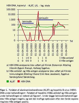 En 46-årig HBs-antigen positiv og hepatitis (H)Be-antigen-negativ mand blev henvist fra en praktiserende reumatolog på grund af smertende ledhævelser, specielt af ankelleddene. Hepatitis B-virus (HBV)-DNA var 1,6 mio. kopier pr. ml. Han havde haft tuberkulose som barn og havde længe, formentlig siden barndommen, været HBs-antigen-positiv. Han havde en let kronisk lymfopeni på ca. 1 mia. lymfocytter/l (normalt 1,4-4,0). Efter 192 dages behandling med lamivudin 100 mg dagligt var ledhævelserne væk, og HBV-DNA kunne ikke længere påvises i blodet (Figur 1 ). Serologien (Figur 1) viste, at HBe-antistof forsvandt efter otte måneders lamivudinbehandling. Efter et år og ni måneder seponeredes lamivudin, men 56 dage efter seponeringen steg HBV-DNA til 40 mio. kopier pr. ml, og alaninaminotransferase (ALAT) steg til 640 U/l, og der kunne nu påvises HBe-antigen og igen Hbe-antistof i blodet, hvorfor behandlingen blev genoptaget med god effekt på ALAT, og man kunne igen ikke påvise HBV-DNA. Efter et år og fire måneder ville patienten atter forsøge at seponere lamivudin, som han mente gav ham åndenød. Hbe-antistof var atter forsvundet fra serum (Figur 1). Efter 41 dage uden lamivudin steg HBV-DNA til 110.000 kopier pr. ml, men Hbe-antigen forblev negativ, og ALAT steg til 113, men herefter faldt HBV-DNA til påviselig, men ikke kvantiterbar mængde, og ALAT normaliseredes.