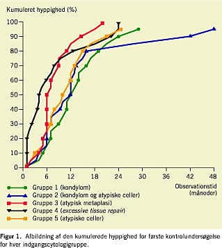 Der blev foretaget 3.536 cervixcytologiske prøver og 347 histologiske udredninger i observationsperioden, der var mediant 51 (1-95) måneder. I alt 94 af de cervixcytologiske prøver blev bedømt som uegnede. Den første kontrolundersøgelse blev udfør t efter mediant 11 (1-84) måneder, hvor værdierne i parentes som lige ovenfor angiver 5 og 95 percentiler). Den kumulerede hyppighed for første kontrolundersøgelse er afbildet stratificeret efter indgangscytologigruppe i Figur 1 . Det ses, at for gruppe 1-5 i rækkefølge var henholdsvis 15%, 25%, 50%, 60% og 25% blevet genundersøgt efter et halvt år, mens tilsvarende procentsatser efter et år var: 50, 60, 85, 80 og 65. Dikotomiseres gruppe 1 efter alder på 30 år, var procentsatserne for de yngste og ældste angivet som ovenfor: 10% vs. 30% og 40% vs. 65%. Sammenlignes tidspunktet for første kontrolundersøgelse i gruppe 1, 2 og 5 med tilsvarende i gruppe 3 og 4 påvises en signifikant median forskel på fem måneder (p < 0,00001, Mann Whitney U-test). Således genundersøgtes kvinder med atypisk metaplasi og excessiv reparativ forandring signifikant tidligere end kvinder i de øvrige grupper. Ved logistisk regression med tidspunktet for første genundersøgelse som den dikotome afhængige variabel (større eller mindre end medianen) og alder samt indgangscytologidiagnose (referencegruppe = gruppe 1, kondylom) som uafhængige variable påvistes det, at alder havde signifikant selvstændig indvirkning på genundersøgelsestidspunktet (odds-ratio (OR) = 0,94, p < 0,00001). Kvinder med atypisk metaplasi blev genundersøgt signifikant før kvinder med kondylom (OR = 0,21, p < 0,00001), mens kvinder med atypiske celler og kondylom (OR = 0,78, p = 0,45), excessive reparative forandringer (OR = 0,43, p = 0,25) eller (atypiske celler (OR = 0,94, p = 0,68) ikke blev genundersøgt signifikant tidligere end kvinder med kondylom. Ældre kvinder og kvinder med atypisk metaplasi blev genundersøgt signifikant tidligere end andre.