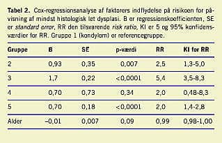 Af de 984 kvinder i analysen fik 559 (57%) ikke siden påvist abnorme fund. Hos de 425, der igen havde abnorme fund, blev der påvist følgende, hvor den alvorligste histologiske diagnose er angivet: let dysplasi (n = 34), moderat dysplasi (n = 34), svær dysplasi (n = 81), carcinoma in situ (n =35) og heraf invasiv cancer (n = 2). Således påvistes der hos 186 kvinder mindst histologisk let dysplasi. De to cancertilfælde blev begge diagnosticeret 21 måneder efter indgangscytologien (i begge tilfælde atypiske celler) med første genundersøgelse efter 15 måneder henholdsvis 19 måneder. Det første tilfælde, stadium 1A1, blev fundet ved konisation, hvor der præoperativt var fundet histologisk svær dysplasi. I det andet tilfælde var der efter 19 måneder og 21 måneder blevet påvist cytologisk svær dysplasi, hvorefter der blev foretaget konisation med fund af cancer stadium 1B, hvor der ikke var makroskopisk tumor, men en fladeudbredelse på 8 mm. Ved en efterfølgende Wertheim-operation blev der ikke fundet nogen resttumor. Den kumulerede estimerede incidens af påvist mindst let dysplasi er vist i Figur 2 , stratificeret efter gruppe. Ved Cox-regressionsanalyse undersøgtes den selvstændige indvirkning af indgangscytologigruppe og kvindens alder på risikoen for senere påvisning af let dysplasi (Tabel 2 . Indgangscytologigruppe 1 (kondylom blev valgt som referencegruppe)). Kvinder tilhørende gruppe 3, 2 og 5 havde henholdsvis en 5,4 gange, 2,5 gange, 2 gange overrisiko i forhold til gruppe 1 for senere påvisning af mindst let dysplasi. Alder var ikke nogen signifikant selvstændig indflydelse på risikoen for senere påvisning af dysplasi.