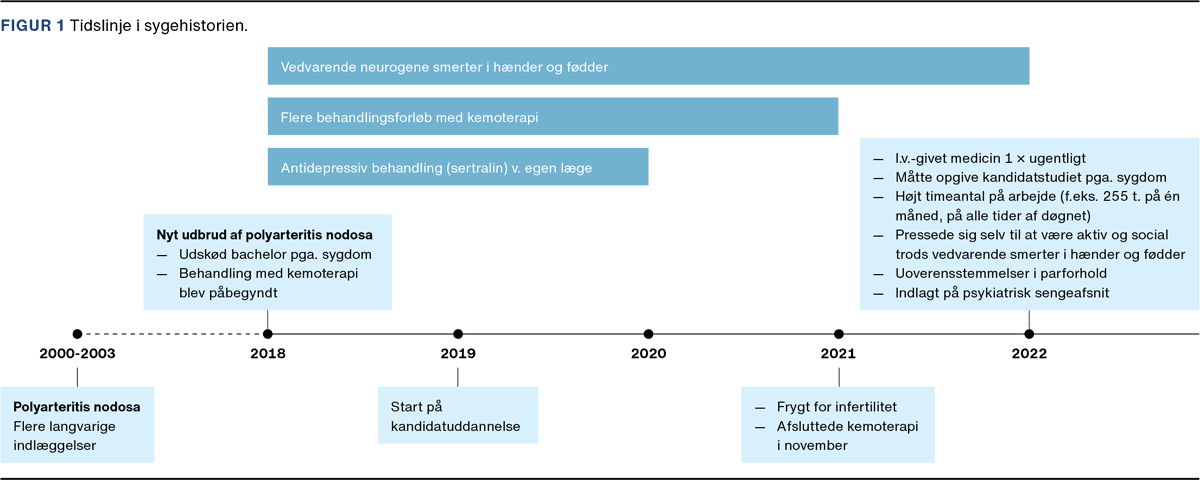 En 29-årig mand blev indlagt på en psykiatrisk afdeling pga. svær depression uden psykotiske symptomer. I årene op til indlæggelsen var der flere belastninger (Figur 1). Patienten blev behandlet for depression via egen læge i 2018-2020 og igen i 2022. Op til indlæggelsen havde man ændret hans behandling fra SSRI til serotonin- og noradrenalin genoptagelseshæmmere og ordineret pregabalin mod angst og zolpidem mod søvnbesvær.