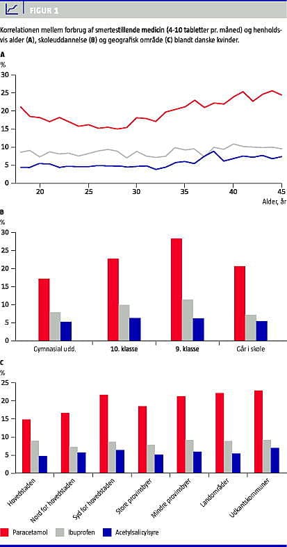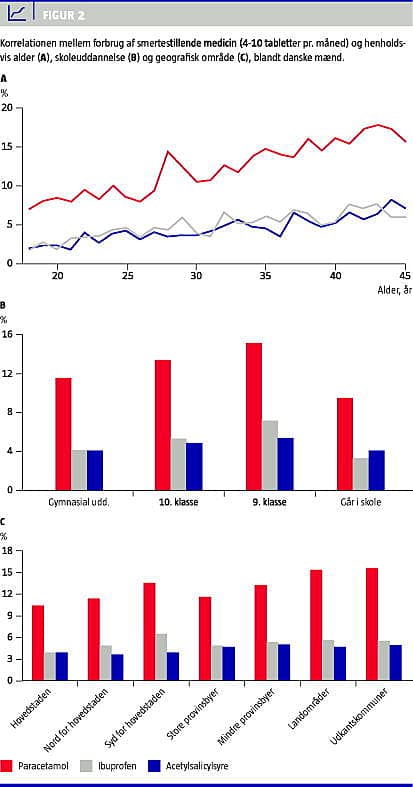 Figur 1 og Figur 2 viser sammenhængen blandt kvinder og mænd mellem et længerevarende sædvanligt månedligt forbrug af paracetamol, ibuprofen og acetylsalicylsyre og alder, skoleuddannelse og geografi.