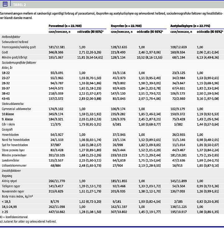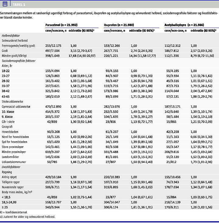 Tabel 1 og Tabel 2 viser for henholdsvis kvinder og mænd sammenhængen mellem et længerevarende sædvanligt højere ugentligt forbrug af paracetamol, ibuprofen og acetylsalicylsyre og selvvurderet helbred, sociodemografiske faktorer og livsstilsfaktorer.