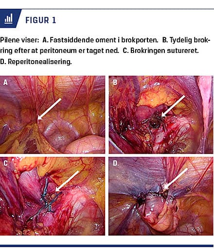 I alle tilfælde blev peritoneum incideret, broksækken reponeret og defekten lukket med Ethibond 0. Peritoneum blev sutureret med V-lock 3.0. Ved ambulant kontrol ca. fire måneder postoperativt var alle uden