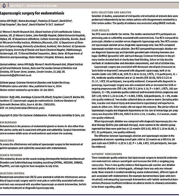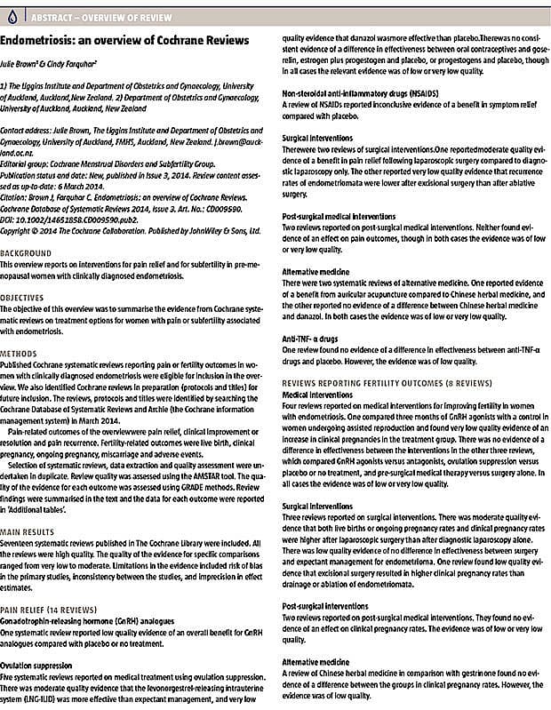 Brown J, Farquhar C. Endometriosis: an overview of Cochrane Reviews. Cochrane Database Syst Rev 2014;3:CD009590.