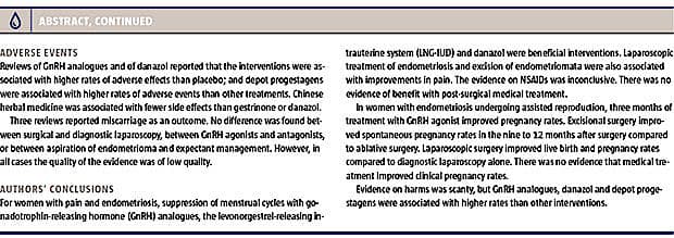 Brown J, Pan A, Hart RJ. Gonadotrophin-releasing hormone analogues for pain associated with endometriosis. Cochrane Database Syst Rev 2010;12:CD000346.
