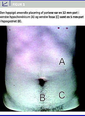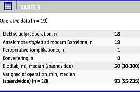 Resultater: 95% af operationerne blev udført elektivt. Den mediane operationstid var 93 minutter, og det mediane blodtab var 50 ml. Konverteringsraten og tredivedages mortaliteten var nul. I et enkelt tilfælde forekom der peroperative komplikationer. Den mediane tid fra operation til flatus var tre døgn og til afføring fire døgn. Den postoperative indlæggelsestid var mediant fem døgn. De hyppigste komplikationer var sårinfektion, absces, ileus og pneumoni.