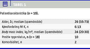 Almene data for de 19 patienter kan ses i Tabel 1 . Rygerstatus var kun beskrevet for 18 af patienterne. To patienter havde komorbiditet i form af henholdsvis thyreotoxicosis og sequelae efter apoplexia cerebri. Tiden fra etablering af diagnosen til operation var mediant otte måneder (0-336). I måneden op til operationen var 14 af patienterne i antiinflammatorisk behandling; 12 var i behandling med steroidpræparater og syv med azathioprin. Ingen af patienterne havde forud for operation været i behandling med tumornekrosefaktor-α-hæmmere.