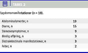 Alle patienter, der blev opereret elektivt, blev endoskoperet forud for operationen. Ved koloskopi påvistes ileocøkal inflammation hos 14 ud af 18 patienter. Hos de resterende fire patienter var penetration af valvula Bauhini ikke muligt. Tre patienter fik påvist aktivitet i øvrige tyktarm ved endoskopi, og fire patienter havde tegn på aktivitet i øvrige tyndtarm ved tarmpassage. Ved histologisk undersøgelse af resektatet påvistes granulomer hos ti patienter, og i alle tilfælde fandtes transmural inflammation.