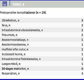 Efter operationen var den mediane tid til flatus tre døgn og til afføring fire døgn. Den postoperative indlæggelsestid var mediant fem døgn (spændvidde: 3-20).