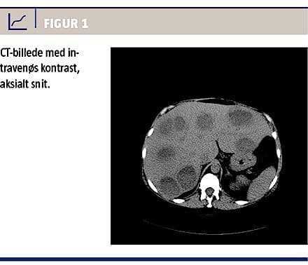 Ved en objektiv undersøgelse fandt man ømhed i epigastriet og under højre kurvatur samt hepatomegali. Biokemiske undersøgelser viste følgende værdier: leukocytose på 15,2 × 109/l og leverpåvirkning med aspartataminotransferase på 40 E/l, basisk fosfatase på 323 E/l og albumin på 34 g/l. Ved CT af abdomen blev der fundet 13 LA, normale galdeveje og intet oplagt primærfokus (Figur 1). Undersøgelse af urin viste normale forhold, og fæces var uden tarmpatogene bakterier eller parasitter.