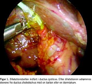 Operationen blev indledt med kolangiografi. Ved fund af sten i de dybe galdeveje blev patienterne enten behandlet transcystisk eller vha. koledokotomi. Kriterierne for transcystisk behandling var sten under 6 mm i diameter, maksimalt fem sten og indmunding af ductus cysticus i højre side af ductus choledochus. Transcystisk stenfjernelse blev foretaget efter dilatation af ductus cysticus med en højtryksballon (Figur 1 ). Ved større sten og ductus choledochus-diameter over 8 mm blev der foretaget stenekstraktion gennem længdeincision i ductus choledochus. Til stenekstraktion anvendtes i alle tilfælde en kombination af ballonkateter og dormea, og ved åben koledokolitotomi blev der foretaget koledokoskopi. Der blev indlagt T-dræn i ductus choledochus efter koledokuseksploration. Patienter med kolecystit eller kolangit blev ikke tilbudt laparoskopisk behandling.