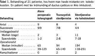 Resultater: Otte patienter fik fjernet sten transcystisk, fire patienter fik fjernet sten ved kolodotomi, og hos ni patienter fandt man ingen sten ved peroperativ kolangiografi. Hos en patient måtte der foretages endoskopisk retrograd kolangiografi med papillotomi og stenfjernelse på grund af de anatomiske forhold, og en patient fik fjernet restkonkrementer. Fire patienter fik komplikationer.