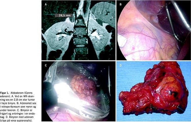 Aldosteromer er på grund af størrelsen på op til 2-3 cm særdeles velegnede til LA (Figur 1 ). Indlæggelsesvarigheden er typisk 1-3 dage, og mere end 90% kureres for hypertension [5]. Lignende resultater ses efter operation for incidentalomer, der som regel er 4-5 cm store. Operation for benigne adenomer hos patienter med mb. Cushing er generelt vanskeligere, dels er tumorerne ofte større (4-8) cm, og dels er patienterne ofte adipøse med vulnerable kar. Indlæggelsen er længere (3-6 dage) med langvarig followup pga. den supprimerede funktion af den raske binyre. Ved fæokromocytom forbehandles med alfablokker, indtil patienten er normotensiv. Tumorerne er meget karrige, men da de sjældent er over 5-6 cm i størrelse, kan de som regel fjernes laparoskopisk. Stort set alle bliver kureret for de typiske hypertensive anfald [5].