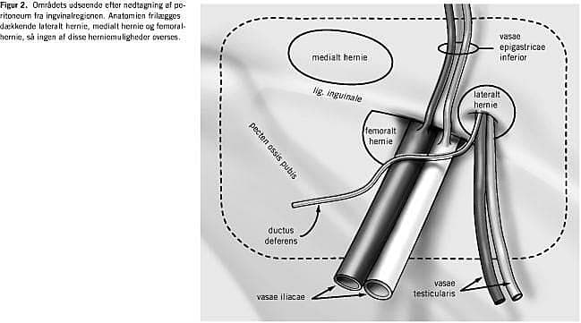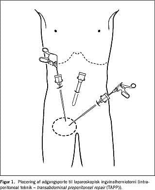 Laparoskopisk operation for ingvinalhernier foretages i generel anæstesi og kan gennemføres som sammedagskirurgisk operation [1]. Der er to operationstyper, den intraperitoneale (transabdominal preperitoneal repair, TAPP) og den ekstraperitoneale (totally extraperitoneal repair, TEP). Ved TAPP anvendes der tre porte placeret ved umbilicus og en i hver side lateralt for rectummusklen (Figur 1 ). En passende peritoneallap løsnes fra ingvinalregionen, idet man medtager broksækken. Ved denne dissektion frilægges anatomien ved lateralt hernie, medialt hernie og femoralhernie, så ingen af disse herniemuligheder overses (Figur 2 ). Herefter placeres en prolenemèche, der dækker hele regionen (uanset den fundne hernietype), og mèchen fæstnes med skruer eller clips. Herefter dækkes mèchen med den løsnede peritoneallap.
