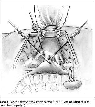 Endelig anvender nogle en blanding af konventionel åben og laparoskopisk kirurgi ved den såkaldte hand-assisted laparoscopic surgery (HALS) [4] (Figur 1 ). Her foregår dissektionen laparoskopisk, men hjulpet af kirurgens nondominante hånd gennem en handport indsat i en ca. 6 cm lang minilaparotomi, der muliggør, at kirurgens hånd indføres i abdomen uden at CO2 -trykket mistes. Selve proteseanastomosen til aorta udføres herefter ved videoassisteret konventionel teknik gennem minilaparotomien, evt. efter at den er forlænget op til 10 cm [5].