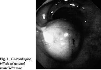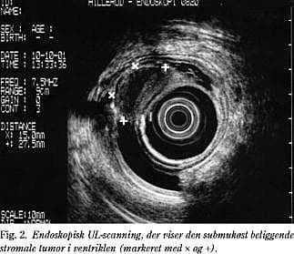 En 64-årig mand, som blev indlagt på medicinsk afdeling til udredning for anæmi (Hb 3,6 mmol/l). Patienten havde op til indlæggelsen været træt og haft sort afføring. Ingen symptomer i øvrigt. Han var i behandling med hjertemagnyl 75 mg dgl. på grund af tidligere AMI. En gastroskopi viste midt på forvæggen af ventriklen en ca. 3 cm i diameter, bredbaset polyplignende dannelse med et fibrinbelagt ulcus i midten (Fig. 1 ). Der blev biopteret herfra. Mikroskopi viste en gastrointestinal stromal tumor (GIST). Man kunne på det foreliggende grundlag ikke udtale sig om tumorens biologiske potentiale. EUL viste, at tumoren var submukøst beliggende (Fig. 2 ). Ventrikelvæggen i øvrigt var normal. CT af thorax og abdomen viste normale forhold. Der blev herefter foretaget laparoskopisk kileresektion af tumoren. Efter etablering af pneumoperitoneum med Veress kanyle indførtes 10 mm trokar samt 30 grader optik ved umbilicus. Der indførtes herefter en 12 mm trokar lateralt i højre hypochondrium og en 15 mm trokar lateralt i venstre hypochondrium. Ved hjælp af en laparoskopisk UL-scanner sikrede man sig tumorens beliggenhed. På begge sider af og lateralt for tumoren sattes i ventriklens forvæg en 2-0 Ethilon holdetråd dobbeltarmeret på lige nåle, som førtes gennem bugvæggen. Man kunne således holde op i det tumorbærende område af ventriklens forvæg, som herefter blev kileformet reseceret i UL-bedømt sundt væv med ENDO GIA II 60 4.8. SULU indført gennem 15 mm trokaren. Resektatet blev anbragt i en pose (LiNA Endobag: EB 60) og fjernet gennem trokarstedet i ve. hypochondrium. Operationstiden var 45 min. Patienten blev udskrevet tre dage efter operationen og kontrolleret første gang ambulant en måned herefter. Det postoperative forløb var helt ukompliceret. Mikroskopi af ventrikelresektatet viste GIST af borderline -type med frie resektionsrande.
