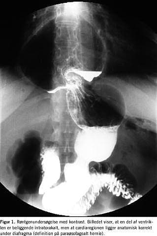 Hernia hiatus esophagi inddeles anatomisk i fire typer. Ved type I (glidehernie) er kun cardia placeret i thorax, mens type II-IV indbefatter lejring af den øvrige ventrikel og evt. andre organer (milt, tarm mv.) i thorax. Udtrykket »paraøsofagealt hernie« (PEH) dækker således hiatus hernie type II, III og IV. PEH udgør ca. 5% af alle hiatushernier [1, 2]. Patienternes gennemsnitsalder er 60-70 år (dog med en betydelig spredning), og lidelsen ses hyppigst hos kvinder [3-5]. PEH er hos voksne typisk en erhvervet lidelse, der opstår pga. en gradvis forstørrelse af hiatus, muligvis grundet en medfødt defekt [2].