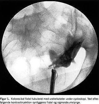 I. En 27-årig kvinde fik recidiverende urinvejsinfektioner og pneumaturi. En cystoskopi viste fistelåbning højt på blærens bagvæg. Ved kontrastinjektion via et ureterkateter i fistelåbningen kunne man se fistelgangen og en colonslynge (Figur 1). En computertomografi (CT) viste luft i blæren og vægfortykkelse af colonslyngen i tæt relation til blærens venstre side. Ved en sigmoideoskopi fandt man en kort koncentrisk benign udseende striktur. Der blev udført laparoskopisk sigmoideumresektion. Man fandt sigmoideum adhærent til venstre blærehjørne. Der kunne ikke findes en fistelåbning i blæren, og ved en efterfølgende fyldning af blæren med metylenblåt kunne der ikke påvises lækage. Der blev ikke foretaget suturering af blæren. Tarmen blev delt distalt og trukket frem gennem Phannenstiels incision, reseceret og anastomoseret med cirkulær stabler. Operationen tog 280 minutter. Patienten blev udskrevet efter fire dage og havde et komplikationsfrit efterforløb. Histologien var forenelig med morbus Crohn.