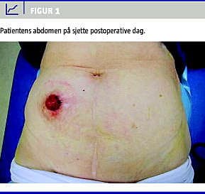 En 83-årig kvinde, der tidligere var hysterektomeret, havde en malign proces i rectum ti cm fra anus og en syv cm stor multicystisk proces i venstre ovarie. En SILS-port (Covidien) blev placeret i en 2,5 cm lang incision svarende til stomimarkeringen i højre fossa. Patienten blev herefter placeret i Trendelenburgs leje, ovariecysten blev fridissekeret, reseceret sammen med venstre adnex og fjernet i en pose. Efterfølgende blev rectum reseceret med laparoskopisk total mesorektal excision (lap. TME), som vi tidligere har beskrevet [3]. Sigmoideum og rectum blev ophængt til forreste bugvæg ved hjælp af transparietale suturer. Der anvendtes medial adgang til dissektionen af vasa mesenterica inferior og visualisering af venstre ureter. Efter deling af vasa rectalis superior udførtes dissektion med lap. Efter deling af vasa rectalis superior udførtes dissektion med lap. TIME-teknik, indtil mesorectum var helt frilagt til bækkenbunden. Lige proksimalt for levatorpladen blev rectum delt med EndoGIA-stapler . Rectosigmoideum blev herefter ført ekstrakorporealt gennem SILS-åbningen, hvori der forinden var placeret sårbeskytter. Den orale del af resektatet blev delt med lineær stapler , og efterfølgende udførtes en konventionel end-to-end- intrakorporeal kolorektal anastomose med cirkulær transanal stapling . Anastomosen lå fem cm fra den anokutane overgang, og der blev derfor anlagt aflastende loop-ileostomi i SILS-incisionen. Operationstiden var 315 min. Blodtabet var tæt på nul. Patienten havde stomifunktion første postoperative dag (Figur 1 ). Hun blev udskrevet i velbefindende til eget hjem på den syvende postoperative dag. Histologien viste et 40 × 35 mm stort adenokarcinom med frie resektionsrande, metastase til tre ud af 13 udtagne lymfeknuder (T3N1) uden vene- eller perineural invasion. Resektatet målte 15 cm i fikseret tilstand. Anale og laterale resektionsrandene målte henholdsvis 10 mm og 15 mm. Ovariecysten var benign.