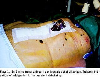 I forbindelse med lukning af bugvæggen blev der i den kraniale del af cikatricen placeret en 5-mms-trokar, der blev sterilt indpakket med en lufttæt forbinding (Figur 1 ).