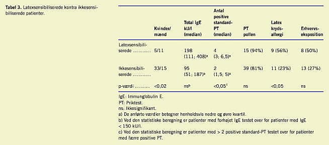 Ved at sammenholde gruppen af latexsensibiliserede patienter med de ikkelatexsensibiliserede fandt man, som allerede omtalt, tydelige forskelle (Tabel 3). Kønsfordelingen var skæv, idet 11 (44%) af mændene mod kun fem (13%) af kvinderne var sensibiliserede (p <0,02). Gruppen af latexsensibiliserede havde højere total-IgE end gruppen af ikkesensibiliserede (median 198 kU/l vs. 95 kU/l). Forskellen var dog ikke signifikant. Endvidere havde de sensibiliserede flere positive standard-PT end de ikkesensibiliserede (median 4 vs. 2; p < 0,05).
