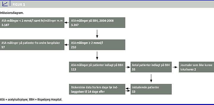 Data tager udgangspunkt i samtlige 3.397 ASA-serumkoncentrationsmålinger, som blev foretaget på Klinisk Biokemisk Afdeling på Bispebjerg Hospital fra 2004 til 2008 (Figur 1 ). Først blev målinger med ASA-serumkoncentrationer, der var større end eller lig med 2 mmol/l, identificeret. Målinger, der var udført for andre sygehuse blev frasorteret. Grænsen på 2 mmol/l blev valgt ud fra den i litteraturen fastsatte grænse mellem terapeutisk og toksisk niveau [2]. Antallet af målinger blev på denne måde reduceret til 113. Ud fra prøvernes CPR-nummer kunne der nu identificeres i alt 55 patienter. Da størstedelen havde fået målt serumsalicylat flere gange, var antallet af målinger større end patientantallet. Ved hjælp af Bispebjerg Hospitals elektroniske journalarkiv blev 53 journaler fundet. To af journalerne på de identificerede patienter kunne ikke fremskaffes. Der blev endvidere rekvireret epikriser for patienter, som var blevet overflyttet med henblik på dialyse. Der blev herefter foretaget en gennemgang, hvor følgende data blev registreret: køn, alder, dosis, tidspunkt for og årsag til indtagelsen, fast medicin, symptomer, behandling samt posthospitalsforløb. Som andre CNS-symptomer blev alle grader af somnolens inklusive koma samt konfusion og uro registreret. Hvis et symptom ikke var omtalt i journalen, blev det kategoriseret som fraværende. Endvidere blev serumsalicylat (også værdier under 2 mmol/l) samt andre væsentlige biokemiske data i relation til indlæggelsen (f em dage før og 14 dage efter) registreret. De fleste biokemiske data blev målt flere gange. Til beregningerne er den mest ugunstige værdi valgt (f.eks. laveste standard-HCO3- , højeste aspartat-aminotransferase, og så videre). Dog er initialværdien af serumsalicylat også undersøgt.