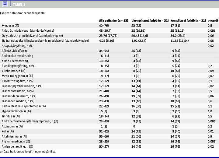 Resultater: Ved komplicerede forløb fandtes flere med en kronisk forgiftning (43% versus 13%, p = 0,02), højere alder (55 år versus 38 år, p = 0,003) og flere medicinsk syge (24% vs 9%,