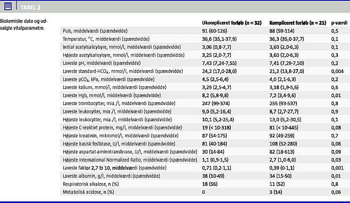 I Tabel 2 ses, hvorledes patienterne fordeler sig på de biokemiske variable samt på udvalgte vitalparametre. Der var ikke signifikant forskel på den initiale serumsalicylat. Heller ikke med hensyn til den højest målte serumsalicylatværdi, som er det nærmeste, vi kommer på peak -koncentrationen, var der signifikant forskel mellem de to grupper. Af a-punkturværdier har vi undersøgt pH, pCO2 samt standard HCO3- . Hverken pH eller pCO2 var signifikant lavere i den komplicerede gruppe. Til gengæld fandt vi en signifikant lavere standard-HCO3- i den komplicerede gruppe. Der var ingen forskel på grupperne mht. hyppigheden af respiratorisk alkalose (pH > 7,43 og pCO2 < 4,9 kPa). Metabolisk acidose (pH < 7,37 og standard-HCO3- < 22 mmol/l) blev kun observeret hos fire af patienterne, som alle var i den komplicerede gruppe.
