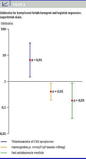 I den multivariate logistiske regressionsanalyse (Figur 2 ) er der tre variable, som slår igennem. Det ses, at især tilstedeværelsen af CNS-symptomer er et dårligt prognostisk tegn, idet oddsratio for at få et kompliceret forløb her er 6,6 (95% KI: 1,5-28,9). At blive behandlet med antidepressiv medicin er derimod en beskyttende faktor med en oddsratio på 0,18 (95% KI: 0,04-0,85). Endelig var en høj Hgb-værdi også forbundet med en mindre risiko for et kompliceret forløb: Oddsratio 0,40 (95% KI: 0,19-0,84) pr. mmol/l Hgb.