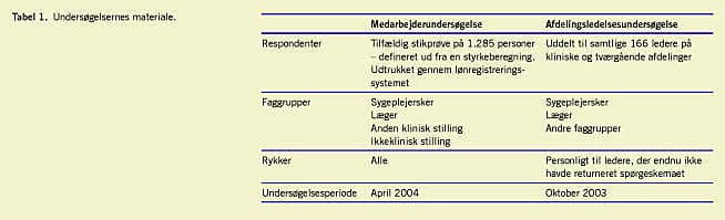 To spørgeskemaundersøgelser blev gennemført i perioden oktober 2003-april 2004. Den ene undersøgelse blev foretaget med samtlige 166 ledere af de kliniske afdelinger som målgruppe og med navngiven besvarelse. Den anden blev gennemført med anonym besvarelse blandt en stikprøve på 1.285 medarbejdere (Tabel 1 ). Undersøgelserne havde til formål at skabe indsigt i, hvor ledere og medarbejdere vurderede, at forbedringer i kvaliteten var påkrævet. Dette blev gjort ved at spørge bredt ind til elementer i patientforløbet med mulighed for en kvalitativ uddybning af svaret. Derudover var det vigtigt at belyse personalets forventninger til akkreditering som et værktøj til kvalitetsforbedring. For at kunne målrette den fremtidige indsats blev ledere og medarbejdere spurgt om deres kendskab til akkreditering og Den Danske Kvalitetsmodel. Desuden blev ledere og medarbejdere bedt om at beskrive, hvilke fordele og ulemper de så ved akkreditering, og hvilke forslag, ønsker og gode råd de havde til den fælles udviklingsproces.