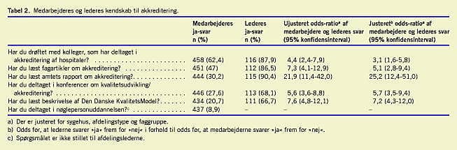 Resultaterne viser (Tabel 2 ), at lederne har en grundlæggende viden om akkreditering. 90% af lederne havde læst amtets rapport om akkreditering [1], 86% havde læst fagartikler om emnet, og 67% havde læst beskrivelsen af Den Danske Kvalitetsmodel [2]. Mere end to ud af tre havde deltaget i konferencer om emnet. Kendskabet hos medarbejderne var betydelig mindre. 30% havde læst amtets rapport, 47% havde læst fagartikler, 21% havde læst beskrivelsen af Den Danske Kvalitetsmodel, og 28% havde deltaget i konferencer. Samlet set havde flest erhvervet kendskab til akkreditering gennem drøftelser med kolleger, som tidligere havde deltaget i akkreditering af hospitaler.