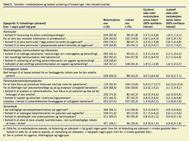 Som det fremgår af Tabel 3, var medarbejderne signifikant mere kritiske end lederne inden for samtlige temaer (kontinuitet, medinddragelse, kommunikation, information, forebyggende indsats, samarbejde og patientsikkerhed/sikkerhedskultur). For eksempel vurderer 53% af medarbejderne mod 14% af lederne, at forbedringer var påkrævet med henblik på at sikre procedurer, der var forbundet med høj risiko for patienterne (justeret odds-ratio (OR) = 6,6).