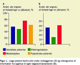 En stor del af lederne og medarbejderne påpegede, at der er forbedringspotentialer i forhold til patientsikkerheden. Det stemmer godt overens med patienternes oplevelser, hvor 17% af de somatiske og 22% af de psykiatriske patienter svarede, at de havde oplevet fejl under indlæggelsen. Ligeledes vurderede både sygehuspersonalet og de somatiske patienter, at forbedringer er påkrævet i forhold til læge-patient-kontinuiteten (Figur 1 ). Derimod syntes personalet ikke i udbredt grad, at der var problemer i forhold til overgangen til primærsektoren (patientens egen læge), hvilket 36% af alle somatiske patienter oplevede, at der var (Figur 1).