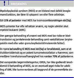 MDS dækker over en bred vifte af kliniske præsentationer lige fra refraktær anæmi til transformation til AML og forekommer hyppigst hos ældre. Fælles for patienter med MDS er, at de ofte er anæmiske. Ved MDS, der tilhører risikogruppen lav eller int-1 , kan anæmien i nogle tilfælde behandles effektivt med erytropoietin evt. suppleret med granulocytkolonistimulerende faktor (G-CSF). Patienter med MDS med del(5q) har imidlertid ofte en høj endogen produktion af erytropoietin, hvilket er associeret med et dårligt behandlingsrespons. De fleste patienter bliver derfor afhængige af blodtransfusioner, hvilket medfører risiko for jernophobning med deraf følgende negativ effekt på morbiditet og mortalitet samt behov for jernkelerende behandling [9]. Lenalidomid er det første middel, der effektivt har ledt til både transfusionsuafhængighed og cytogenetisk remission hos patienter med MDS, der tilhører risikogrupperne lav og int-1 med del(5q). Lægemidlet har ligeledes effekt på transfusionsbehovet hos patienter med MDS, der tilhører samme risikogruppe, men som ikke har del(5q) [11, 12]. Desværre er der for nylig opstået tvivl om, hvorvidt behandling med lenalidomid kan øge risikoen for transformation til AML.