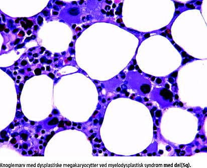Ved primær MDS har 40-60% af patienterne kromo-somforandringer i knoglemarvscellerne, mens frekvensen ved terapirelateret MDS er helt oppe på 90%. Den hyppigste kromosomforandring ved MDS er del(5q), som ses hos 10-15% af patienterne [7]. Nogle af disse patienter har det såkaldte 5q-syndrom, defineret som de novo -MDS med en isoleret del(5q) omfattende 5q31-32, der kaldes commonly deleted -region (CDR) og under 5% blaster i knoglemarv og blod. Syndromet kendetegnes klinisk af refraktær makrocytær anæmi, normalt eller øget trombocyttal, eventuelt let leukopeni og typiske hypoloberede megakaryocytter i knoglemarven [7, 8]. Disse patienter har en gunstig prognose med en medianoverlevelse på 107 måneder, hvilket dog er signifikant kortere end for en matchet kontrolpopulation [9]. Patienter med MDS med isoleret del(5q) og > 5% blaster i marven har en signifikant kortere medianoverlevelse på 24 måneder og ved forekomst af yderligere > 2 kromosomforandringer falder den til 7,4 måneder. 80% af disse patienter progredierer til AML [9]. Del(5q) medfører ved AML dårlig prognose og ses oftest sammen med andre kromosomforandringer [10]. Ved molekylære analyser af 5q31-32 er det vist, at CDR ved 5q-syndromet er beliggende mere distalt i området, mens CDR ved avanceret MDS eller AML med del(5q) ligger mere proksimalt [9, 10].