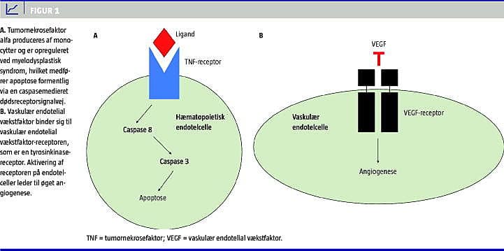I de tidlige faser af sygdommen er billedet domineret af apoptose, der medfører ineffektiv hæmatopoiese og dermed cytopeni, blandt andet via opregulering af tumornekrosefaktor alfa (TNF-α). TNF-α produceres af monocytter og medfører apoptose formentlig via en caspasemedieret dødsreceptor-signalvej (Figur 1A ) [2]. Vaskulær endotelial vækstfaktor (VEGF) er ligeledes opreguleret, hvilket medfører en øget angiogenese (Figur 1B) [3]. Knoglemarvens vaskularitet er direkte korreleret med andelen af myeloblaster, og VEGF er dermed forbundet med sygdomsprogression [4, 5].