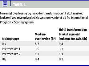 Prognosen i form af overlevelse og risiko for transformation til AML kan bedømmes ved hjælp af International Prognostic Scoring System (IPSS), i hvilket man inddeler patienterne i fire risikogrupper (lav , intermediær-1 (int-1 ), intermediær-2 (int-2 ) og høj ) ud fra antal linjer med cytopeni i blodet, cytogenetiske afvigelser og blastandel i knoglemarven (Tabel 1 ) [6].