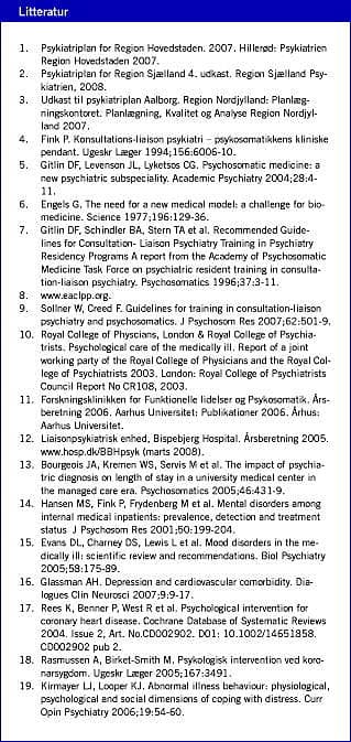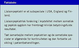 Liaisonpsykiatri blev præsenteret første gang i Danmark i 1994 [4], men er fortsat et relativt ukendt område. I denne artikel fokuseres der på udviklingen i området og på væsentlige, nyere forskningsresultater. Liaisonpsykiatri har udviklet sig i grænsefeltet mellem psykisk og somatisk lidelse, og håbet er at formidle, at området rummer mange potentialer til bedring af fremtidens patientbehandling. Desuden udgør liaisonpsykiatri en væsentlig facet af det psykiatriske speciale.
