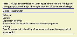 En model for fremtidigt samarbejde kunne være, at (liaison)psykiateren får en rolle som rådgiver for de behandlende somatiske læger og praktiserende læger og en uddannelsesfunktion for yngre læger og andet sundhedspersonale. Liaisonpsykiateren kunne desuden have en rolle som koordinator i et klinisk arbejdende team, der i hver region kunne danne et kompetencecenter. Medvirken til udvikling af nationale, kliniske retningslinjer ses som en væsentlig funktion med henblik på at udpege fokusområder for diagnostik, behandling og forskning inden for det liaisonpsykiatriske felt (Tabel 1 ).