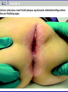 I. En fireårig pige blev henvist fra egen læge pga. uafklaret genitalt udslæt siden spædbarnsalderen. Pigen havde svær genital kløe, rødme, smerte, obstipation og tidvist blod i trusserne. Tilstanden blev primært opfattet som bledermatitis og svampeinfektion. Patienten blev via egen læge behandlet med lokalt antimykotikum, uden at der sås nogen bedring i tilstanden. Objektivt fandt vi et klassisk porcelænshvidt udslæt med ottetalskonfiguration ( Figur 1 ) involverende vulva og huden perianalt. Diagnosen lichen sclerosus blev stillet på baggrund af det kliniske billede, og der blev iværksat behandling med gruppe 4-lokalsteroid med eklatant effekt. Forældrene udtrykte i forløbet stor lettelse over at få klarlagt diagnosen, da de gennem fire år med det uafklarede forløb havde gjort sig mange tanker.