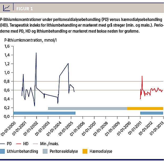 Sygehistorien viser, at lithium kan anvendes til hæmodialysepatienter, hvis der doseres med fast relation til dialysebehandlingerne. Lithiumbehandling kan overvejes hos de patienter, hvor andre psykofarmaka har vist sig at være utilstrækkelige til at opretholde et neutralt stemningsleje. Da lithium elimineres meget langsommere under dialysebehandling end ved normal nyrefunktion, skal P-lithiumniveauet hyppigt monitoreres i starten mhp. optimal dosering. Baseret på vægt, alder og køn samt med anvendelse af tokompartmentmodeller rekommanderes en lithiumdosis på ca. 12 mmol efter hver dialysebehandling [1], dette vil sikre et stabilt plasmaniveau og en optimal komplians. Hos patienten i sygehistorien var det sværere at opretholde et stabilt P-lithiumniveau og opnå neutralt stemningsleje i peritonealdialyse. Dette skyldes muligvis manglende komplians.