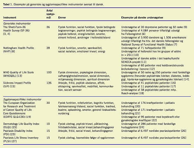 Hidtil har man inden for sundhedsvidenskaben overvejende anvendt såkaldt objektive parametre ved vurdering af behandlingseffekter og helbredstilstand, eksempelvis mortalitet, morbiditet, funktionsstatusmål, arbejdsstatus og komplikationer. Sådanne parametre er imidlertid sjældent udtømmende mål for den patientoplevede sygdomsbyrde, og der forekommer ofte afvigelser mellem objektive sygdomsparametre og patienternes oplevede belastning. Blandt andet på denne baggrund er der opstået behov for supplerende metoder til vurdering af helbredstilstanden baseret på patienternes egen opfattelse. Inden for de senere år er det blevet mere udbredt at supplere objektive helbredsmål med målinger af selvrapporteret livskvalitet. Formålet med denne artikel er at give en kort introduktion til livskvalitetsbegrebets anvendelse i sundhedsvæsenet samt en beskrivelse af metoder til vurdering af kvaliteten af spørgeskemainstrumenter.