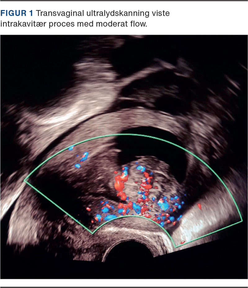Ved stuegang seks timer senere sås fortsat pågående blødning, som blev estimeret til 600 ml på lejet. Transvaginal ultralydskanning viste moderat flow i den intrakavitære process (Figur 1) og det underliggende myometrium. Rigeligt flow i kombination med kraftig blødning rejste mistanke om sarkom. Man konfererede med onkogynækolog på højtspecialiseret sygehus, som anbefalede at undgå hysteroskopi. Hgb = 4,0 mmol/l efter i alt fem portioner SAG-M, men rotationel tromboelastometri var normal, og der var således ikke længere tale om medicinsk blødning. Der blev givet yderligere to portioner SAG-M og en portion trombocytter. Man forberedte at anlægge en komprimerende ballon i uterus. Patienten blev informeret om, at der ved ukontrollabel blødning var risiko for, at man måtte foretage hysterektomi. Da patienten ikke samtykkede til hysterektomi og på det tidspunkt var transportabel med lægefølge, blev det i samråd med højtspecialiseret sygehus besluttet at udføre akut CT-angiografi og overflytning med henblik på embolisering.